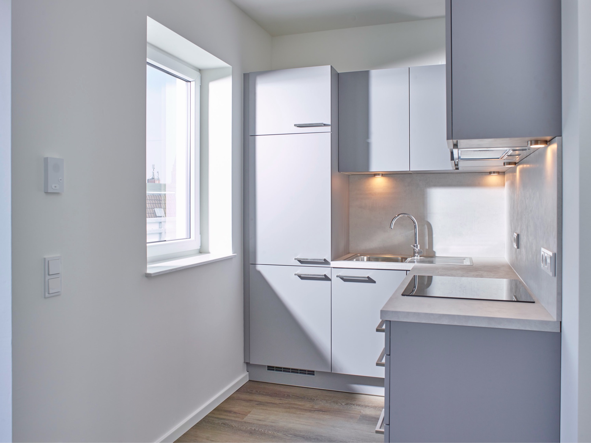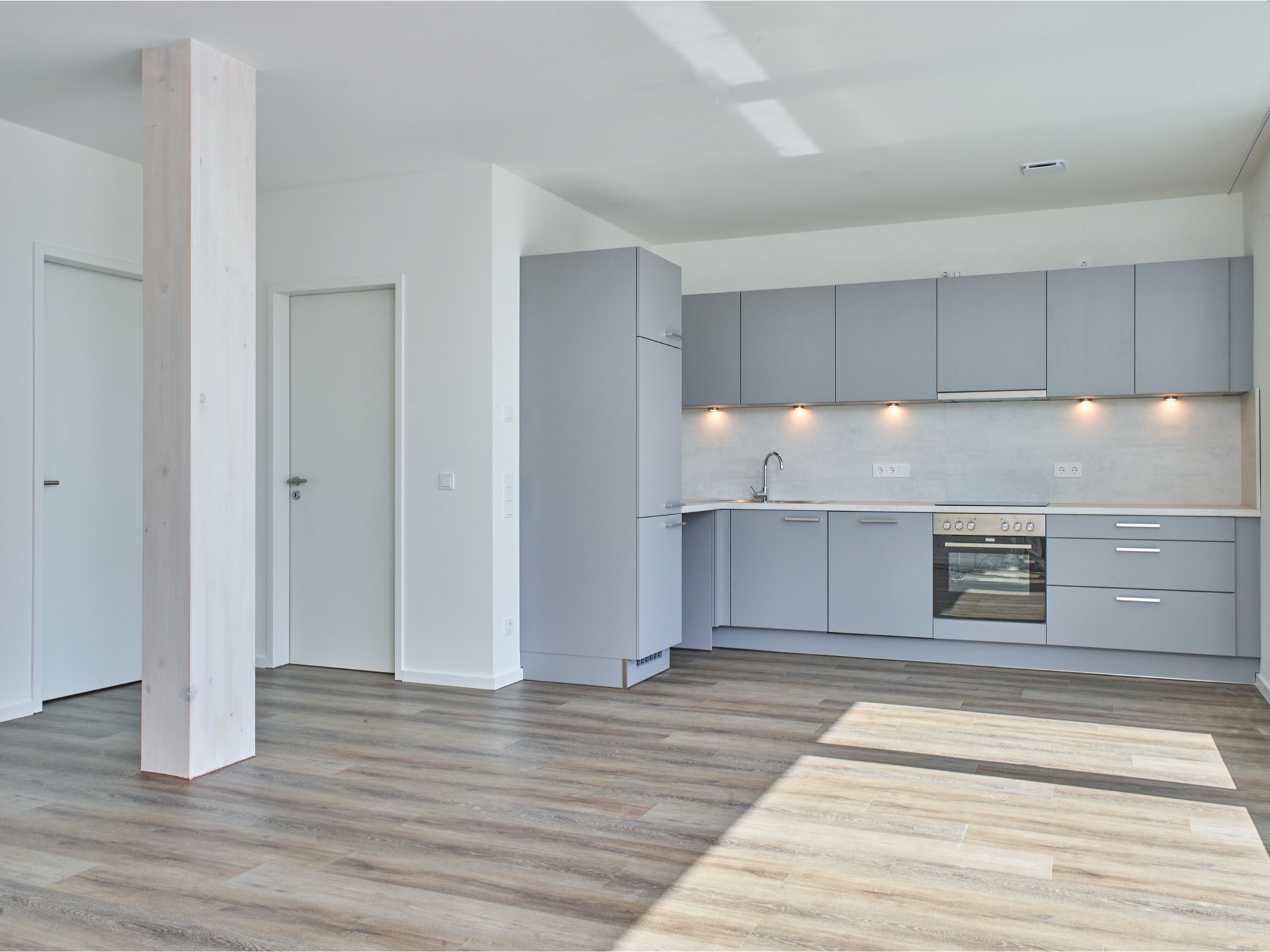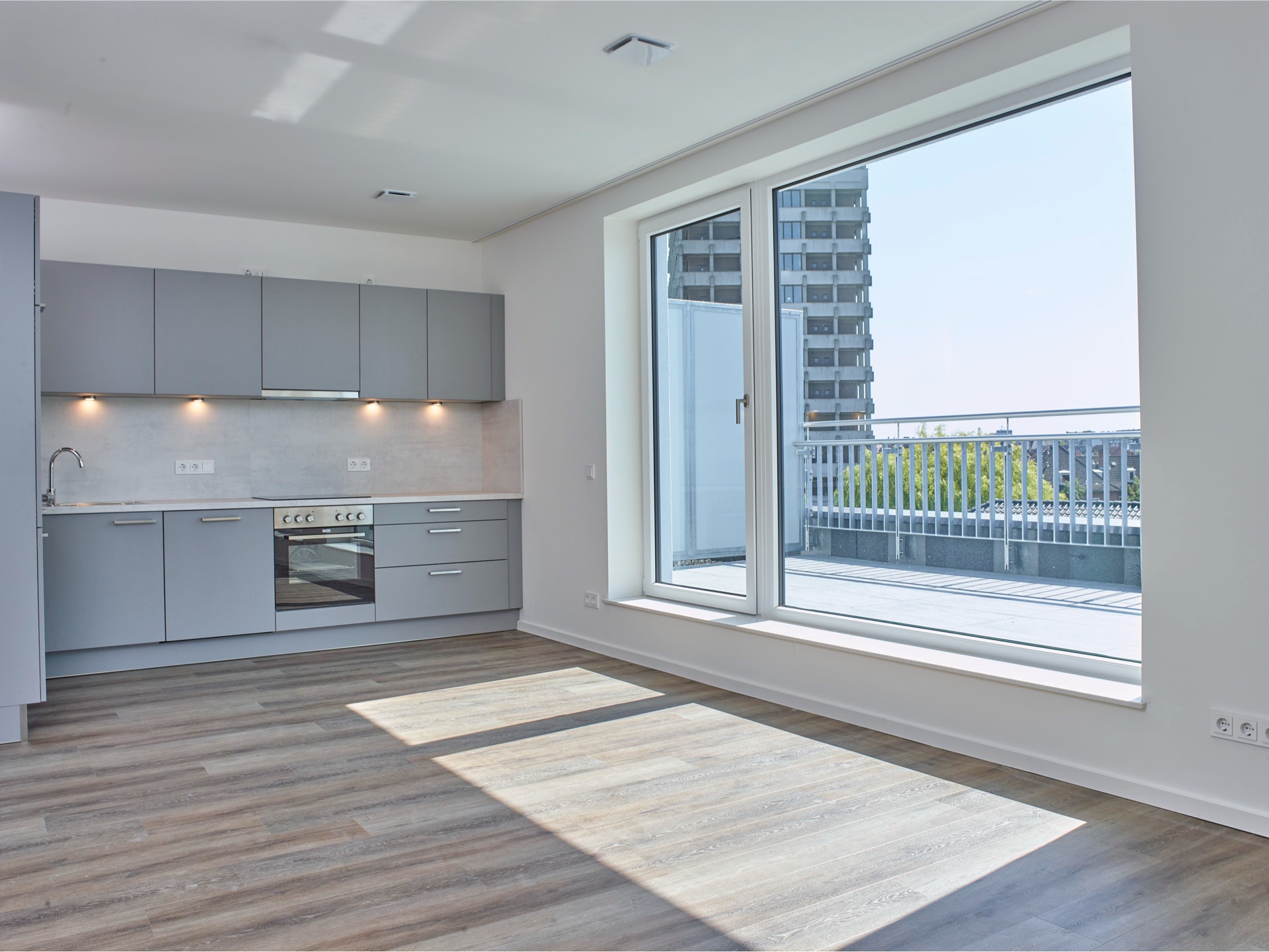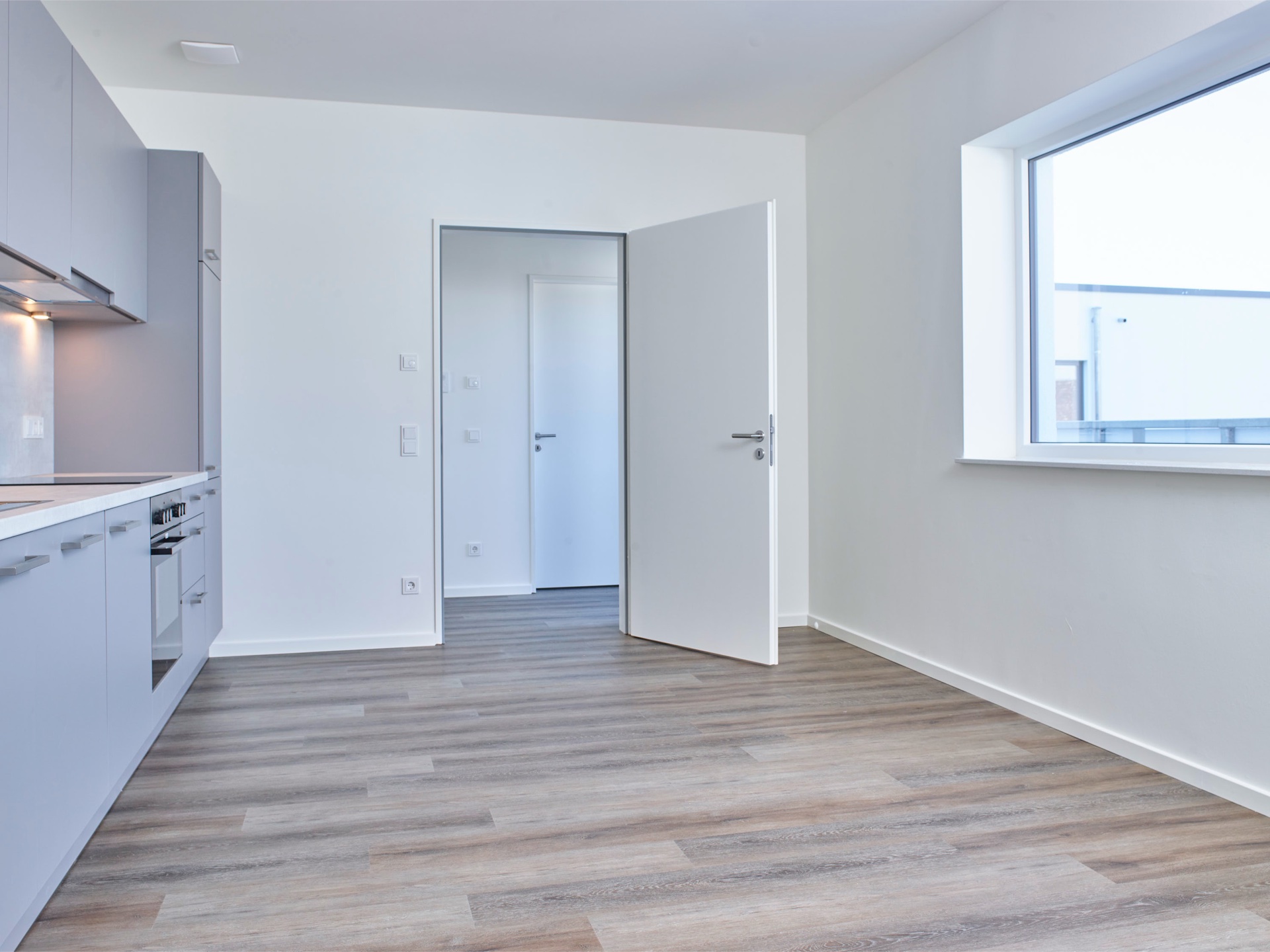 Helle Wohnräume mit bodentiefen Fenstern. Offen integrierte Küchenzeile mit Induktions-Kochfeld, Backofen, Kühlschrank und Geschirrspüler. Großzügiger Wohn-Essbereich und separates Schlafzimmer. Top ausgestattetes Duschbad. Die großen Dachterrassen sind nach Süden ausgerichtet.