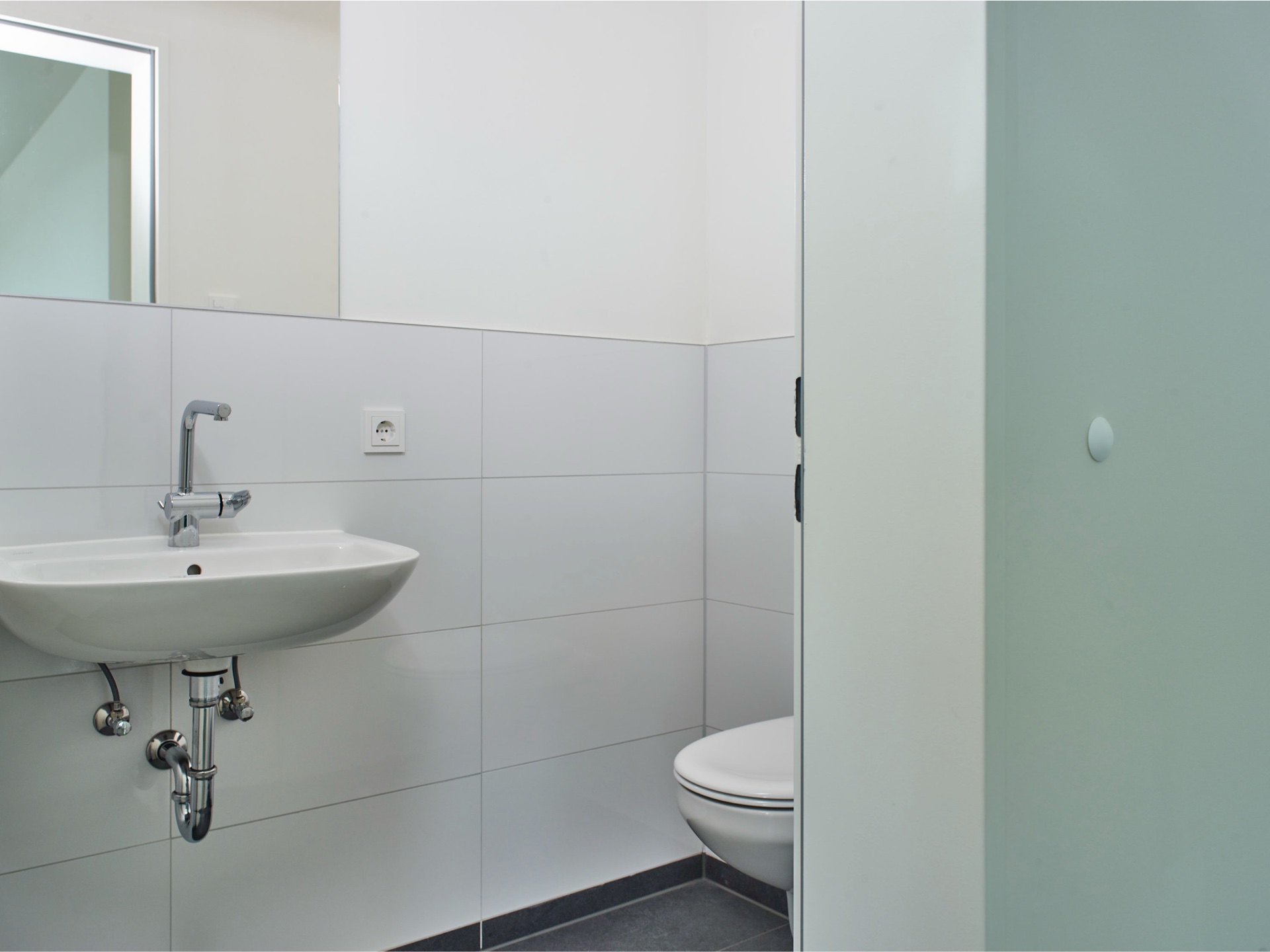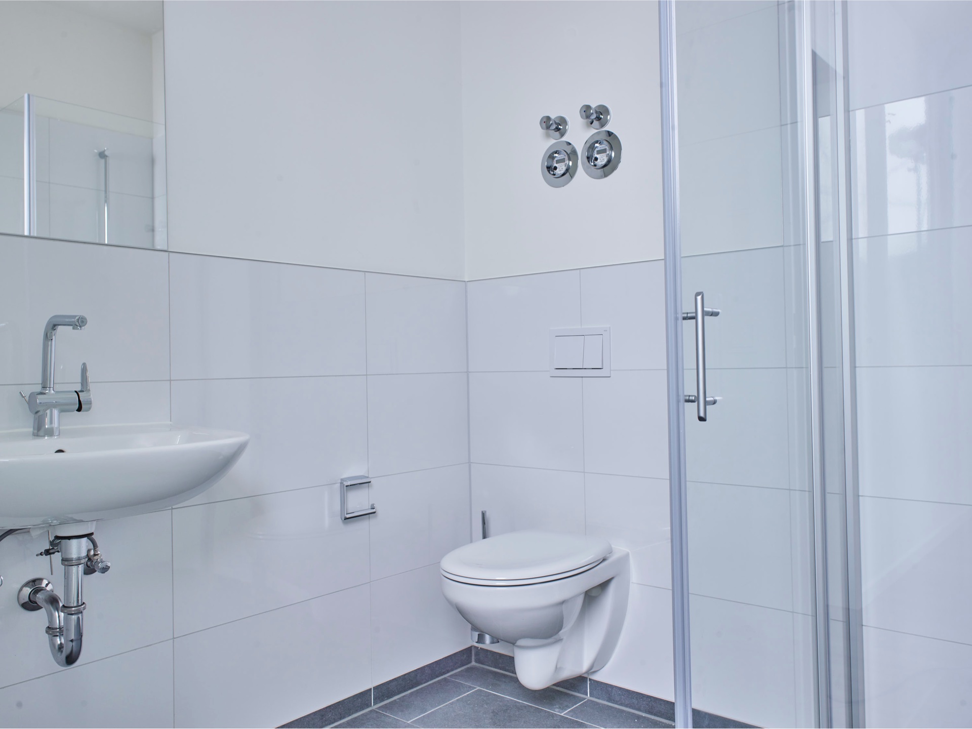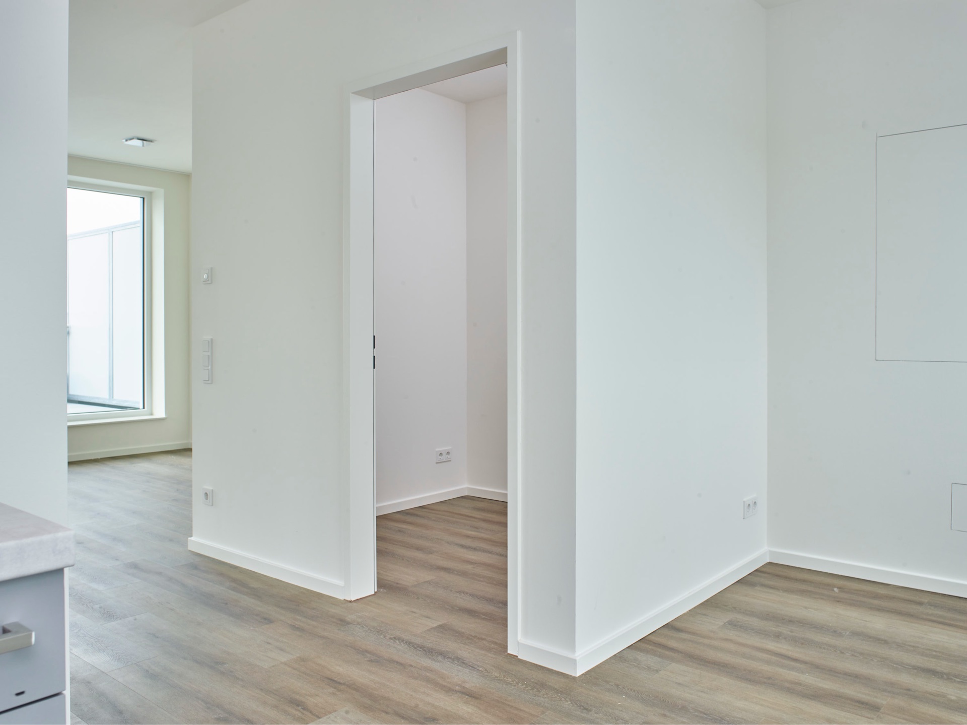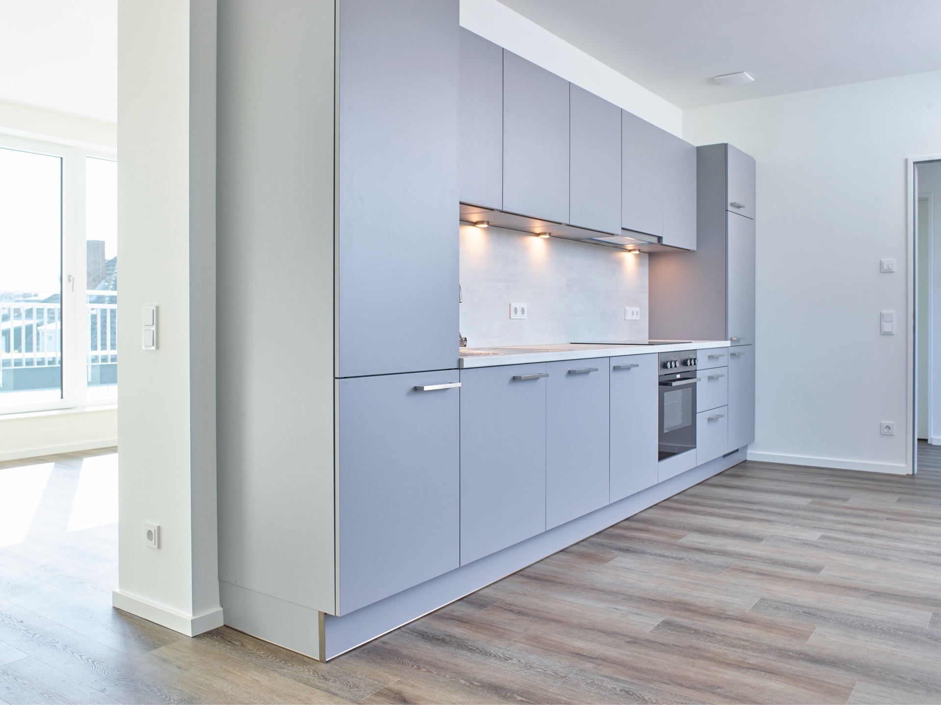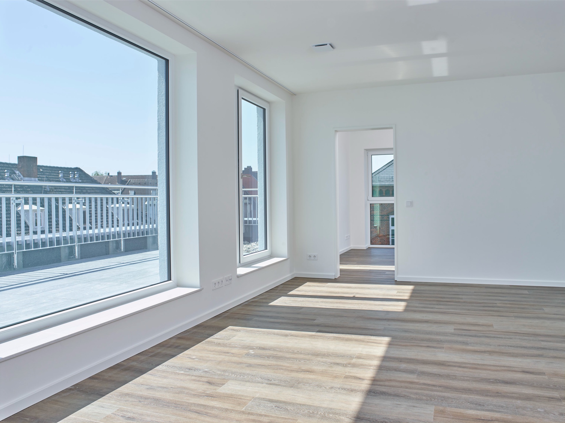 Helle Wohnräume mit bodentiefen Fenstern. Offen integrierte Küchenzeile mit Induktions-Kochfeld, Backofen, Kühlschrank und Geschirrspüler. Großzügiger Wohn-Essbereich und separates Schlafzimmer. Top ausgestattetes Duschbad. Die großen Dachterrassen sind nach Süden ausgerichtet.